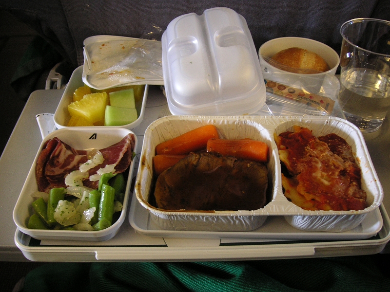 2時間ほどして機内食。イタリアンと日本食が選べた。イタリアンにした。内容は牛肉の煮たやつ+人参、ラビオリ、サラダ(生ハム、セロリ、いんげん豆)、果物(パイン、メロン、オレンジ)、パン、アメリカンコーヒー、ビール。かなりうまかった。