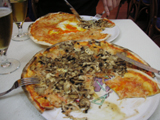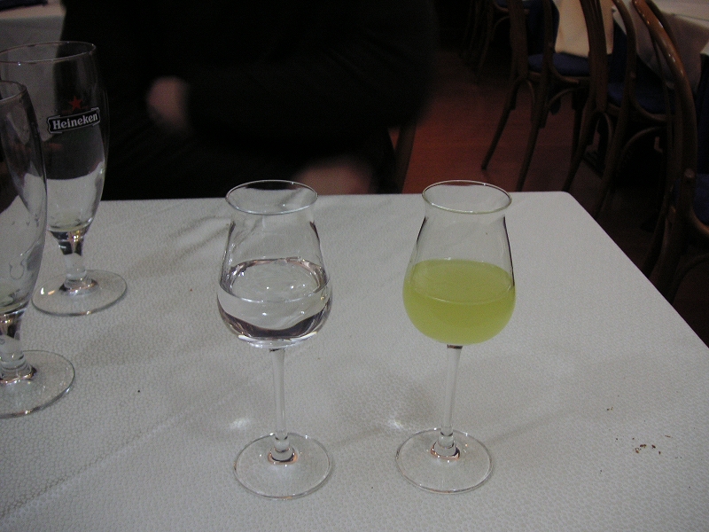 飲み物はビール birre。ピザは一人一枚がイタリア流らしい。ローマのピザはパリパリで薄いので、軽く食べられた。とてもうまくて満足した。適当に入った店にしては当たりである。グラッパはワインを蒸留した透明な酒で、白酒(パイチュウ)みたいで臭くてきついんだが、脂っこいものをたくさん食べた後だったのですっきりした気がする。リモンチェッロはレモンの皮を砂糖と焼酎に漬けた黄色い酒で、いいにおいがした。