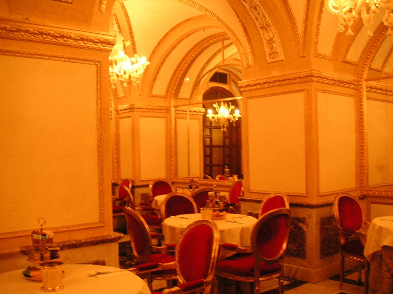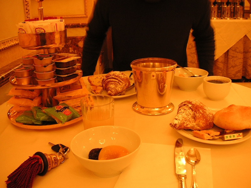 朝食。レストランが異様にゴージャスな造り(19世紀的な意味で)で笑ってしまう。客は誰もいなかった。コンチネンタル式ということで、基本的にパンぐらいしか置いていない。甘いクロワッサン(コルネcorne)、アメリカンコーヒー(極めてまずい)、パイナップルジュース、ケーキ、黄桃(シロップ漬け)、プルーン(シロップ漬け)を食べた。プルーンがあんずみたいで意外とうまかった。