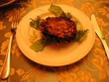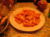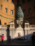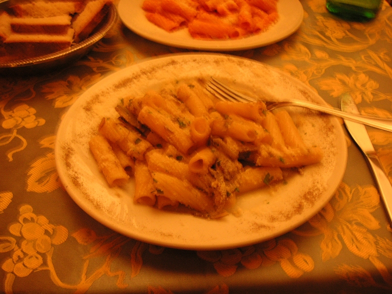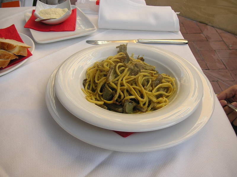 その後、歩いてゲットーへ。ここにとても美味しいユダヤ料理のレストランがあると聞いて来たのだが、満席で入れず。「予約なし?じゃあ一時間は待つよ」「タイムイズマネー」とか言われた。というわけでその近くの別の店「Al Portico」に入った。トリッパ(=「ハチノス」のトマト煮)とアーティチョークのリガトーニを注文したら「名物のユダヤ風アーティチョークcalchofi judiaはどうだい?」と聞いてきたので、つい頼んでしまった。これはアーティチョークの丸揚げで、まぁうまいのだが、せっかくのホクホクの食感がパリパリに揚がってしまっているので、ちょっと残念だった。…というか、揚げすぎで苦い。あと、全体的に味付けが塩辛かった。あと値段が高かった、ということでこの店はあまりよくなかった。まあ、ローマ名物のトリッパが食べられたのでよしとしよう。