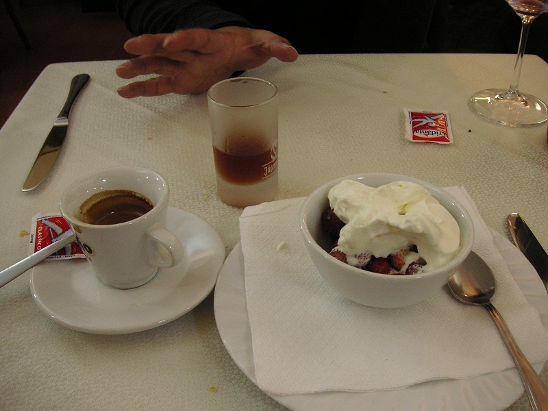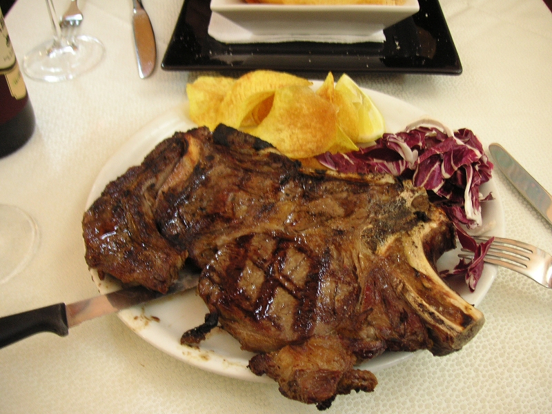 ビステッカが巨大で、500グラムもあるのには驚いた。これでで13ユーロだから、日本の感覚では安いと思う。しかもうまかった。スパゲッティは塩辛くて今ひとつ。デザートは単純なのにとてもうまかった。
