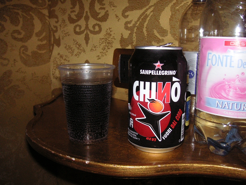 前に買っていた謎のドリンク「CHINO」(キーノ、サンペレグリノ社)を飲んだ。見た目はコーラっぽいが、味は苦くて甘くて(みかんの皮?)薬っぽい。チンザノのような味だった。酒は入ってない。後で調べると、酒が飲めない人がバールで飲んだりするものだそうだ。