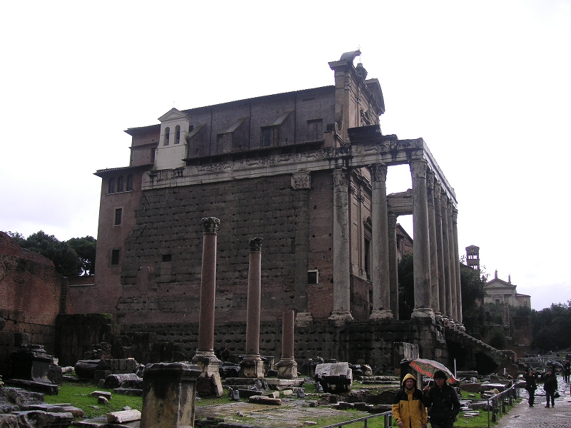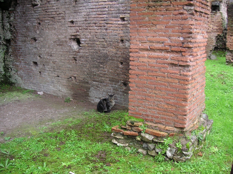 コロッセオを出て、近くのフォロ・ロマーノにいった。これは、昔の市街のあとである。街自体が展示されているので、とても広い。あまりにもぼろぼろなので、これまた古代人の生活を想像するのは難しかった。(帰ってからCGで復元した図を見るとなるほどと思った)思い入れが深い人なら「ここがカエサルが殺された場所か!!」とか思うんだろうけど。日本で例えると、平城宮跡みたいなものだ。ここに入ってしばらくすると雨が降り出し、だんだんひどくなった。出ようにも出口は何キロも先だ。逃げ場のない広い野原の真ん中でひどい雨に降られているという状況はかなり辛かった。途中、また猫がいて、遺跡の屋根の下で雨宿りをしていた。晴れている日ならもっとたくさんいるそうだ。