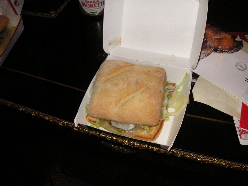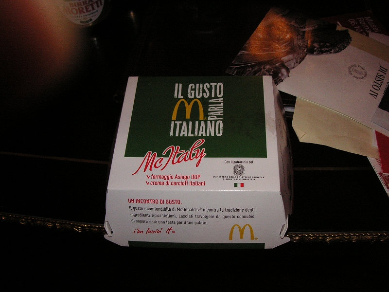マックイタリーは高かったのだが、残念ながらまずかった。なんだか味がないのだ。宣伝文句には「バンズは100%イタリア産小麦、肉は100%イタリア産牛肉、イタリア産レタスにイタリア産なんとかチーズにカルチョーフィソースでイタリアらしく仕上げました」などということが書いてあり、ポスターもそこら中で見たのだが、こんなのならその辺で安いパニーノを買った方がはるかにうまい。そういえば買うときけっこう並んでたが、誰も頼んでなかった。ドバイで食べた「マックアラビア」はうまかったんだけどな。ビールのんで寝た。疲れた。