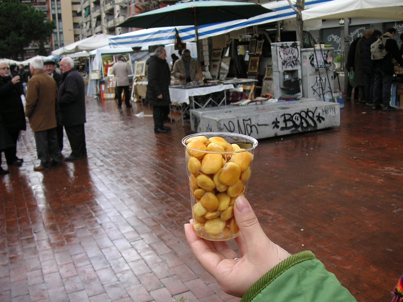 黒っぽいおっさんが万能野菜カッターを実演販売していた。どうみてもサクラと思われる男が「よし買った!」みたいなことを言っていた。布やレースばかり売っている屋台があり、妻がロシア風の布を1ユーロで買って喜んでいた。オリーブ塩漬け味見。味は悪くないんだが、かなり塩辛い。子どもが一人1カップずつ食べていたので、そんなに塩辛いものだとは思わなかったのに。味見して買わないのもあれなので、かわりに空豆の塩漬けをコップ一杯買った。味は悪くはないのだが、やはり塩辛くて全部は食べられなかった。