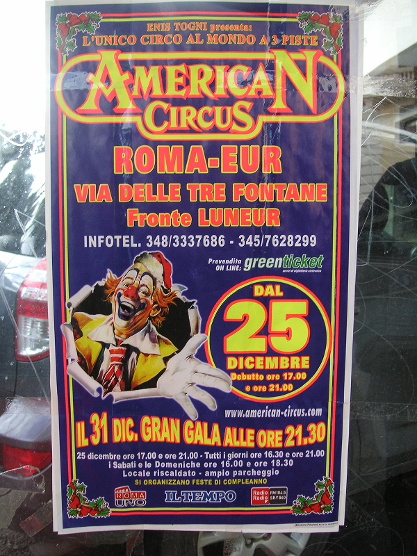 しばらく歩いていると、ジェラート屋があったので入ってみた。3種盛りで2ユーロだった。キャラメル、ラム、みかんの皮みたいなのの三つにした。まあうまかったが、少し水っぽかった。よく分からない公園のあたりまでいって帰った。公衆電話に「アメリカンサーカス」という怪しいポスターが貼ってあったのが印象的だった。