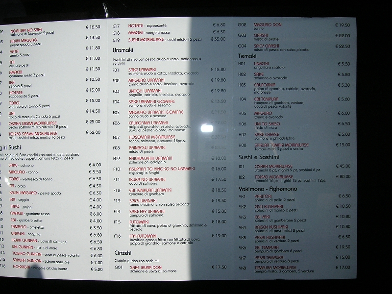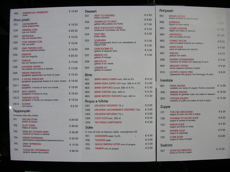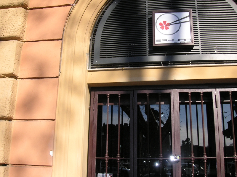 ホテルの近くに「Sakura」という日本食レストランがあった。かなりファッショナブルな雰囲気で、毎晩大勢の気取った若い男女で賑わっていた。メニューは寿司、丼、酒など。けっこう高かった。メニューの写真を撮っておいた。