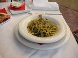 Bersagliere」で昼食をとる。ここで、幻のローマ野菜と言われたプンタレッレのサラダを食べる。冬の数カ月だけ、ローマだけでしか売られない珍しい野菜で、歯ごたえのある水菜という感じだった。アンチョビとオリーブオイルであえて食べる。アンチョビが生臭いがすぐに慣れた。ショリショリしていてうまかった。他にもカーショ・エ・ペーペ(胡椒とチーズのパスタ)、ペンネ・アラビアータ、瓶ビール。なかなかうまかった。