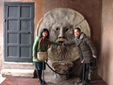 チルコマッシモの端にあるサンタ・マリア・イン・コスメディン教会「真実の口」で記念撮影をする。これは古代のマンホールのふたらしい。後ろに人が並んでいたのであせってしまい、ローマの休日ごっこができなかった。